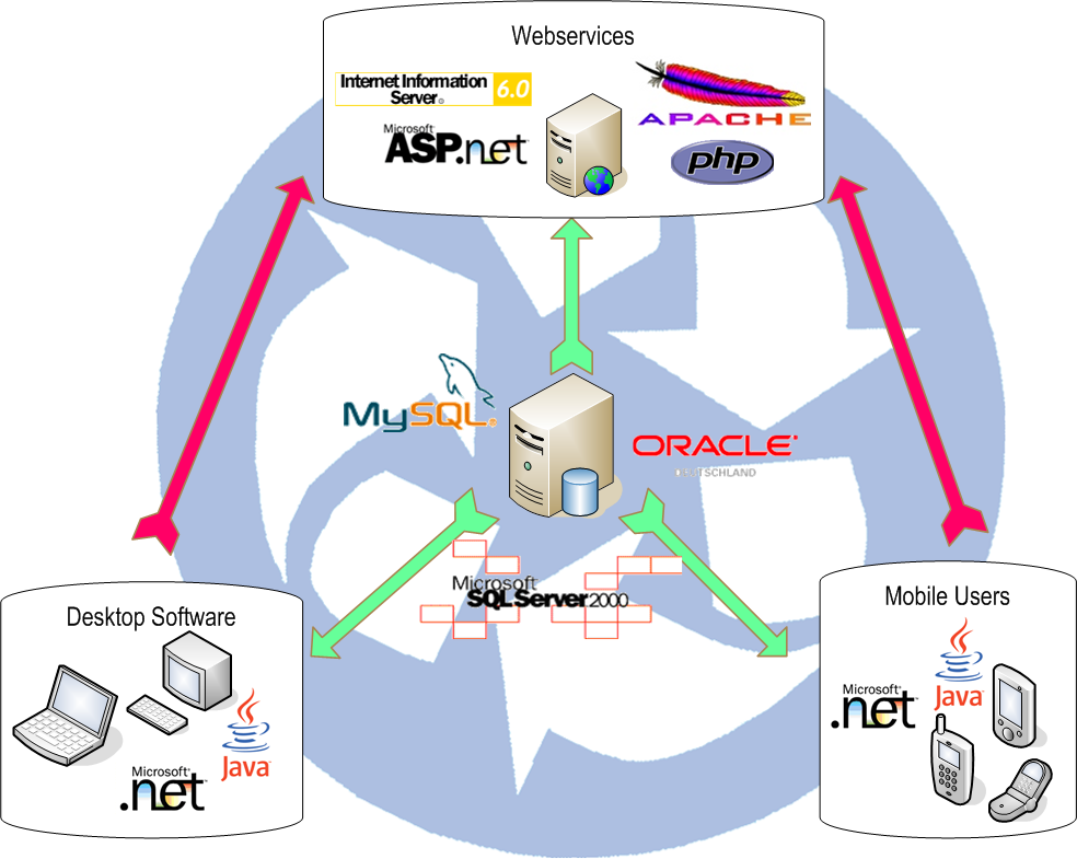 .NET verbindet bereits heute eine Vielzahl von Technologien (vom Handy bis zum Business-Server) und ermöglicht Ihnen damit, auf wichtige Informationen zuzugreifen, wann immer und wo immer sie benötigt werden. Mit .NET und dem XML-Standard bzw. einer Datenbankanbindung, gleichgültig ob über ODBC oder nativ erhalten Ihre neuen Anwendungen Zugang zu anderer Software und wichtigen Services – unabhängig von Plattformen, Anwendungen und Programmiersprachen.